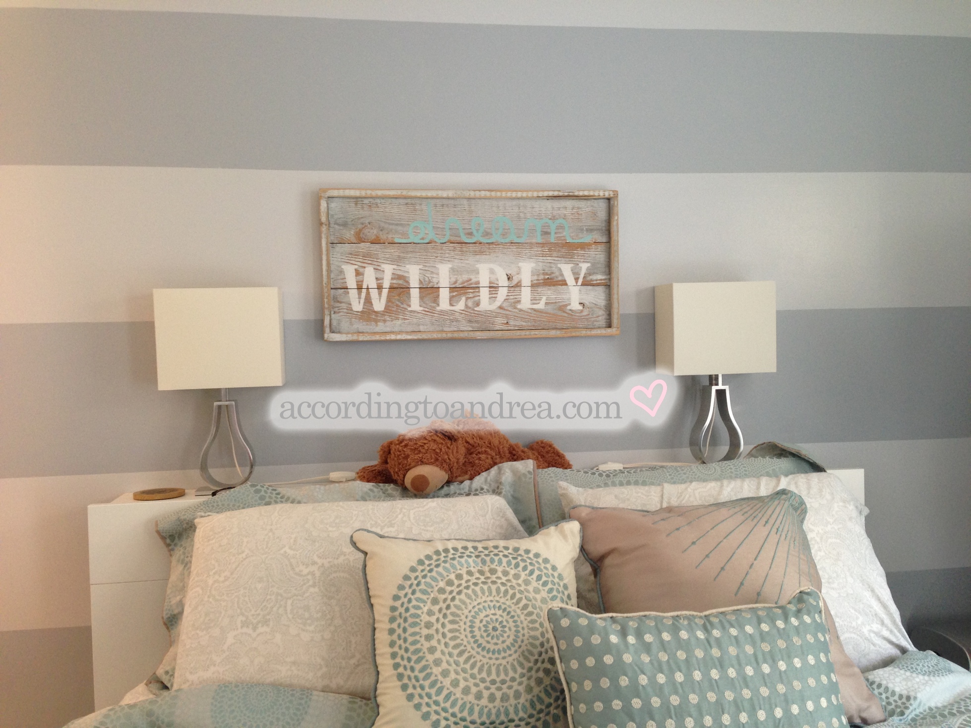 The first big change actually happened a year ago – PAINT. I do have to say, I’m still incredibly fond of the pink and green paint scheme I came up with at 15. I’m also proud of the painstaking multi-step process of painting, tracing, and then taping a level stripe around my room. It was a labor of love that I was truly sad to see go. {Plus it’s pretty hard to be sad or tired when your room looks like a bag of Skittles exploded.}