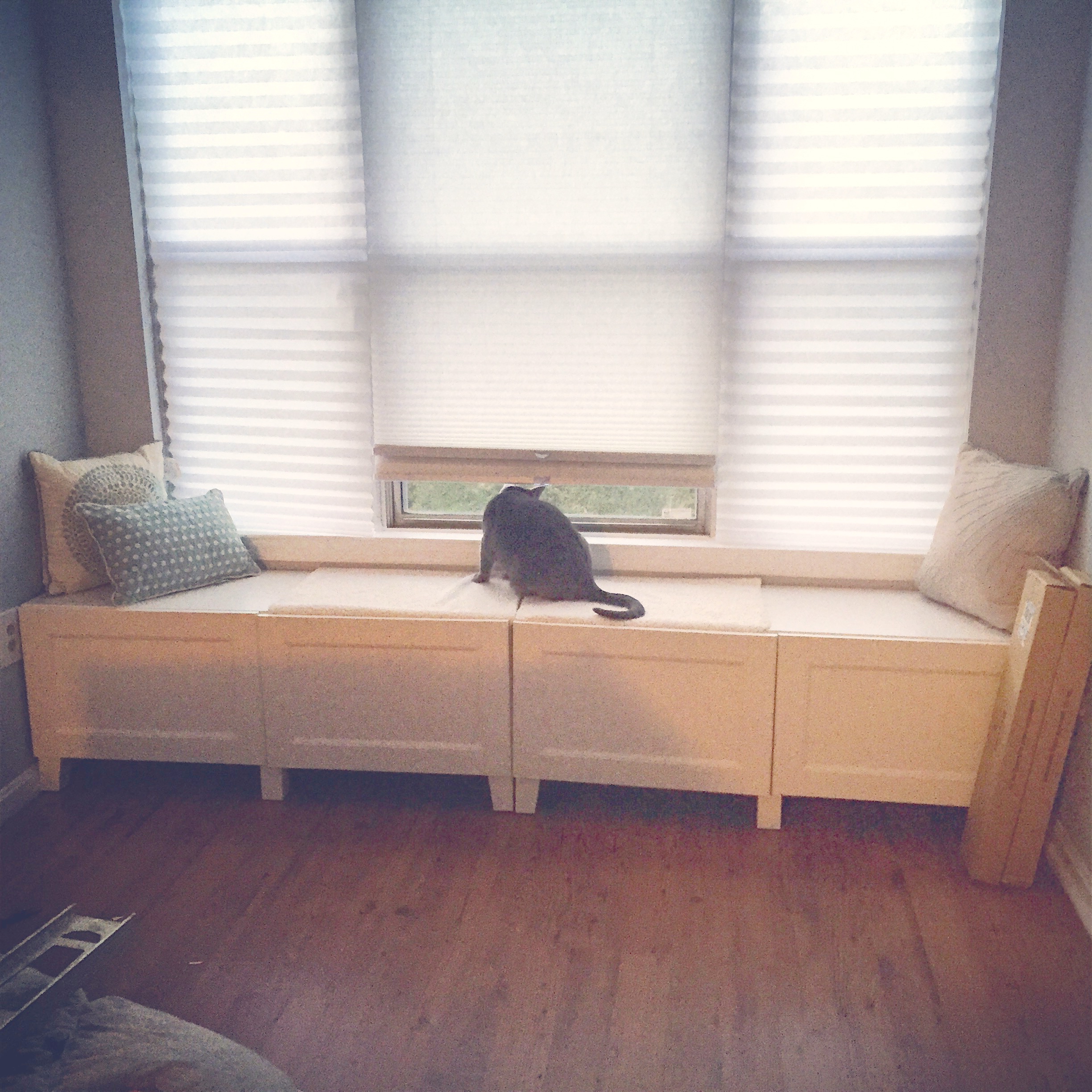 Second project of the week was putting together the window bench in the master bedroom. I never got to complete the entertainment center/desk combo I had designed for my old room, so I had left over cabinetry still in boxes. Turns out some of that cabinetry fit perfectly in the nook in the master bedroom. As expected, it turned into an instant cat magnet. Not expected was how the cats now growl at everyone walking by.