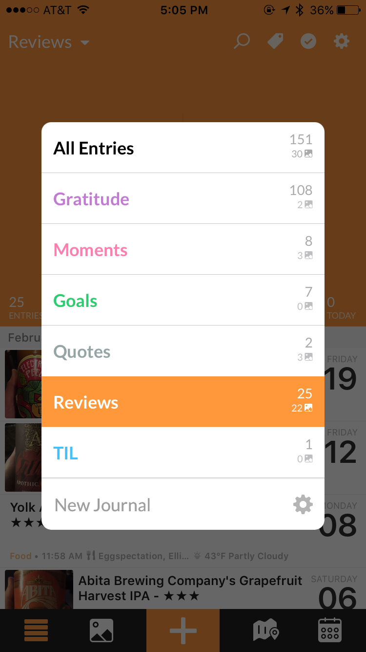 • Reviews is probably my most favorite journal. Despite the picture below making it seem like I only eat at DuClaw, my boyfriend and I actually do enjoy trying new places to eat and drink, and this journal gives me a place to record what I love and, occasionally, what doesn’t love me back so that I know never to order it again. I also use it for books, movies, and music. It’s turned into my own personal combination of Yelp, Untappd, Goodreads, and Rotten Tomatoes. Plus it’s downright nice to look at. It takes 5 seconds to grab a photo and use Text Expander snippets to log what and by whom or where, along with a 1-5 star rating. Day One also tracks location and time so I can quickly see a map of where I’ve eaten and the calendar view provides a nice overview of when. I also tag these by type which allows me to filter the list based on type, location, date, or name.