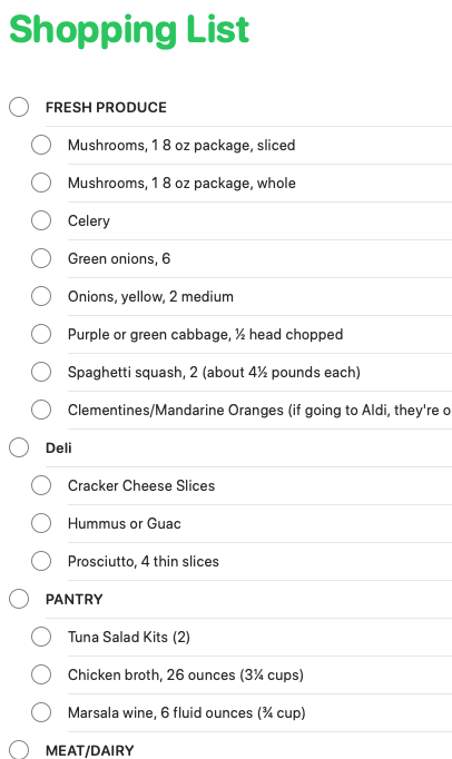 I was already saving our favorite recipes from each week into my recipe manager, Paprika, for safekeeping, and Paprika’s built-in menu feature makes creating custom weeks almost as easy as having them in the book. To make a custom week, I pick 3 of our recipes with similar ingredients to add to the menu. In the description section of the menu, I note any meal prep instructions specific to those meals. Since many of the ingredients are similar, we can still take advantage of prepping in bulk ahead of time.  As far as the grocery list, Paprika does all the heavy lifting to combine like ingredients and generate a grocery list that can be sent directly to our shared shopping list in Reminders.