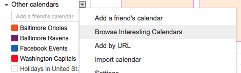 I use Google Calendar as the backend for all my calendaring needs, so I subscribed to it there, but you can use whatever calendaring app you want. Most should support it. Along with the Facebook Events Calendar, I also subscribed to calendars for my favorite sports teams. Just add them by clicking Browse Interesting Calendars. For added ambiance, I set the color of the calendar to match the team colors. (Note: these are read-only calendars. Information only syncs one way – to you. You cannot change events on these calendars.)