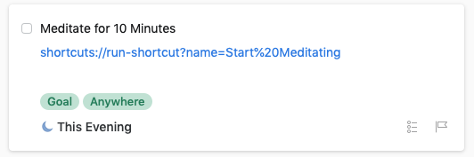 Like Shortcuts, Keyboard Maestro can launch automations via URL, but it has one super power over Shortcuts’ URLs – the ability to pass a value through a URL. This means we can use it as a common URL base to run the shortcut above for any note just by changing the URL.
